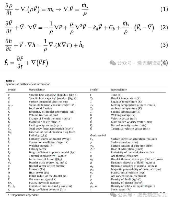 開發了一個三維笛卡爾模型來分析TP-GMAW工藝獲得的熔池中的輪廓和對流。在支持相變能力的計算域中考慮牛頓和不可壓縮流體的層流。熔池由電磁力、浮力和表面張力共同驅動。為了簡化數值模型,等離子體熱對液滴的影響通過液滴的初始溫度來考慮。根據這些假設,總共四個控制方程(包括質量連續性、動量連續性(納維爾-斯托克斯)、能量守恒和VOF)根據方程一起求解。分別為(1)至(4)。表3列出了一系列變量。為了分析熱傳遞和熔池輪廓,采用了FLOW-3D商業軟件,特別是因為該軟件通過拉格朗日VOF平流法跟蹤移動的自由表面具有很高的精度。