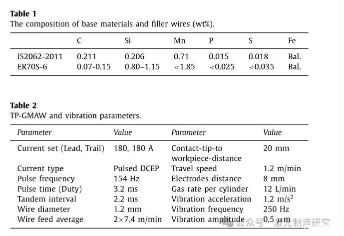 在IIT海得拉巴使用機器人TP-GMAW設施進行焊接實驗,其中兩個電極分別通過焊槍饋送并從兩個獨立的電源接收電力。電源以反相方式同步,以防止后電弧和前電弧之間的相互作用。氬氣82%–二氧化碳18%用作保護氣體。機器人焊接設備由KUKA公司的KR30六軸機器人組成,該機器人與Fronius公司的兩個數字焊接電源相連。跟蹤電極和引導電極的電流設置為180 A.通過保持焊槍垂直于工件,在平面位置進行長度為200 mm的堆焊。本研究中使用的基材是由鐵素體-珠光體結構組成的熱軋低碳鋼IS 2062-2011。絲狀電極是直徑為1.2毫米的ER 70-S。母材和焊絲的化學成分列于表1。使用容量為150±0 kgf的Sdyn電動振動機來產生振動。