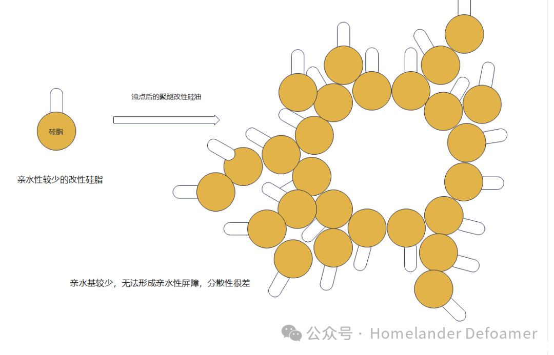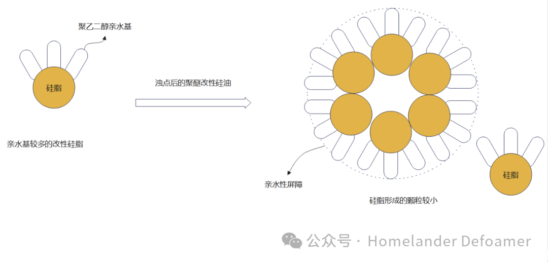 乳化劑既然很容易脫落,那么可以用化學鍵的方式,把乳化劑接枝在硅脂上,這樣即使析出,在沒有外加乳化劑和剪切力的情況下也能將析出的硅脂分散到體系中。這對親水基與親油基分子量的把控極其重要。若親水基太大,形成水包油的顆粒太小,雖然不析出。但是太小的微粒排液時間久,消泡速度就很慢。