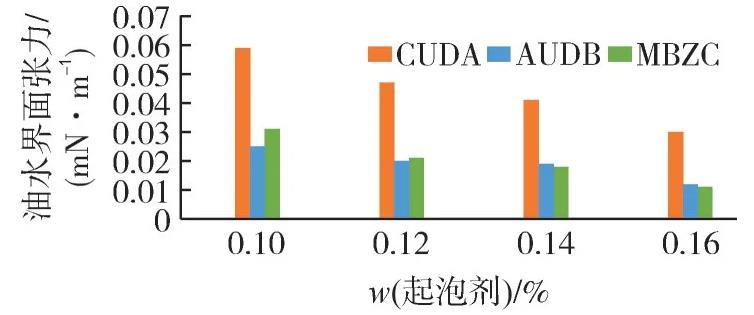 由圖3可知:隨著起泡劑用量的增加,3種起泡劑的油水界面張力逐漸降低,且在質(zhì)量分數(shù)達到0.16%時,油水界面張力降低到最低值,其中AUDB與MBZC型起泡劑的油水界面張力均低于0.02 mN/m,達到低界面張力驅(qū)油的要求。