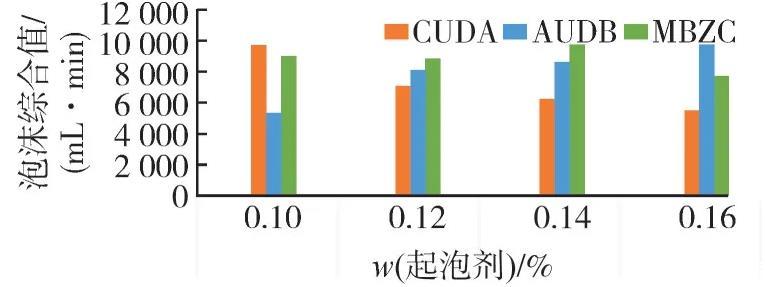 由圖2可知:隨著起泡劑用量的增加,CUDA型起泡劑的泡沫綜合指數(shù)逐漸下降;AUDB型起泡劑的泡沫綜合指數(shù)逐漸升高,且在質(zhì)量分數(shù)達到0.16%時達到峰值9 762 mL·min;而MBZC型起泡劑的泡沫綜合指數(shù)先上升后下降。由此可見,AUDB型起泡劑的泡沫強度最高。
