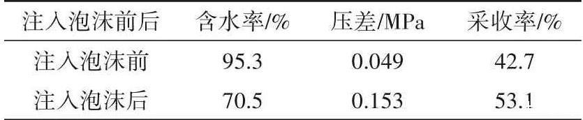 由表1可知:在注入泡沫前,采出液的含水率達到95.3%,在向膠結(jié)巖心中注入0.3 PV的泡沫流體后含水率顯著下降到70.5%,注入泡沫流體前后壓差達0.104 MPa,說明AUDB型起泡劑混合氮氣形成的泡沫具有良好的封堵效果。注入泡沫流體后,采收率明顯提高,由42.7%提高至53.1%,說明AUDB型起泡劑具有良好的洗油效果。