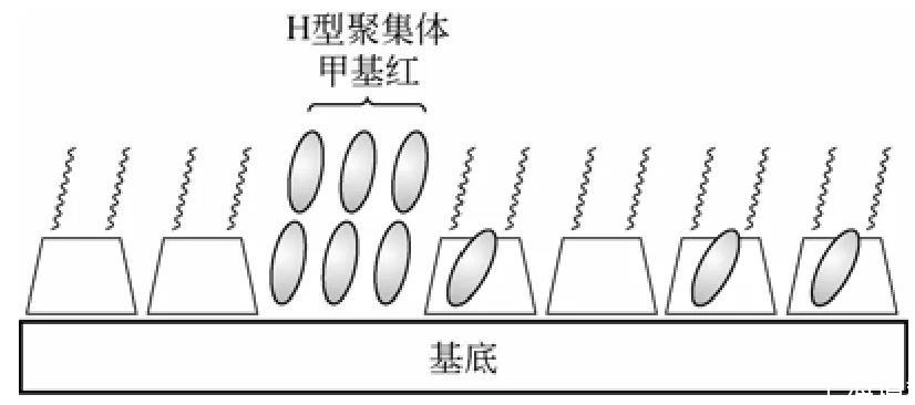 兩親性環糊精不僅能夠單獨組裝成LB膜,也能夠和其他有機分子共同組裝成雜化LB膜。Matsumoto課題組在兩親性環糊精和偶氮苯LB雜化膜方面做了大量的工作。因為偶氮苯化合物能夠在光照條件下發生可逆的順反光異構反應,若將偶氮苯在固體基底上進行組裝將對光儲存、光轉換器件的發展具有十分重要的意義。但是由于在單純LB膜中,偶氮苯分子周圍自由體積很小,限制了順反光異構反應的發生,而利用兩親性環糊精和偶氮苯雜化組裝成LB膜以解決這個問題。研究表明部分偶氮苯被包結在環糊精的空腔中,空腔為水溶性偶氮苯發生可逆的光異構化反應提供了良好的場所。此外,環糊精疏水鏈段也能夠成為容納客體分子的場所,而且在膜中并非所有的環糊精分子都會包結偶氮苯分子,剩余的未包結環糊精為進一步功能化提供了基礎。但是在該雜化膜中會有部分偶氮苯分子形成的聚集體(圖2),所以進一步增加雜化分子的包結率和分散性是這一類雜化膜的研究方向。