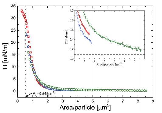 壓力面積等溫線是通過壓縮獲得 在朗繆爾槽上涂抹單層膜,用于 3 組不同的 實驗。 這些等溫線中的區域坐標被縮放 由吸附在界面上的顆粒數量決定。 一切 曲線折疊成單個圖,如圖 1 所示。 增加壓縮,壓力最初變化很小,但 每個顆粒低于 2 mm2,壓力會急劇增加。 曲線的斜率首先增加,但達到 最大在 ~27 mN m- 1 處有一個拐點 其次是稍弱的斜率。 面積值 對應于該拐點的粒子 (Ac) 結果為 為 0.545 mm2,如圖 1 中的虛線所示。假設 顆粒緊密堆積,這對應于~835 nm 的顆粒間距離,遠大于 在本體中測量的顆粒的流體動力學直徑 溶液 (590 nm) 表明顆粒確實是 大幅度變形。 如圖 1 的插圖所示,有限 0.5 mN m- 1 級的表面壓力(即遠高于我們的 檢測限為 0.1 mN m- 1 ) 事實上已經可以測量了 每個粒子的面積約為 4 mm2 . 插圖還表明 P 的絕對值可再現在 0.3 mN m- 1 以內 在兩個不同朗繆爾的不同實驗之間 槽。