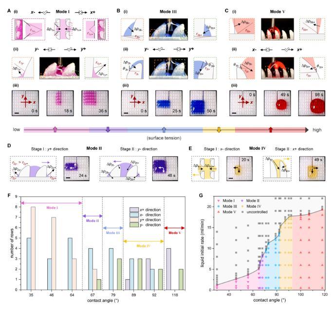 注入結(jié)構(gòu)化表面的液體首先填充相鄰四個單元間的空隙,并在單元的特定曲率結(jié)構(gòu)處形成局部曲率不等的液體彎月面,這導(dǎo)致液體表面不同位置的拉普拉斯壓差不同,進(jìn)而驅(qū)動液體定向運(yùn)輸。隨表面張力從低到高(22-72 mN/m),液體呈現(xiàn)出五種不同的運(yùn)輸模式(I至Ⅴ)。研究人員利用水-乙醇溶液對這五種模式下液體沿x軸和y軸方向上的運(yùn)輸行為進(jìn)行力學(xué)分析(圖2)。表面張力較低的液體對界面的潤濕性較高,因此主要在單元底部曲率結(jié)構(gòu)作用下,沿拉普拉斯壓差較低的方向運(yùn)輸;而表面張力較高的液體會在結(jié)構(gòu)化表面上積累,其運(yùn)輸方向由單元頂部曲率調(diào)控。
