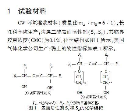 對于環(huán)氧樹脂灌漿材料,加入表面活性劑對漿液的黏度、表面張力、接觸角、固化物的力學性能及對被灌體的滲透性有何影響?目前這方面的的研究少見報道。而這些研究對環(huán)氧灌漿材料的開發(fā)以及灌漿施工都具有非常重要的意義。本文以長江科學院CW環(huán)氧灌漿材料為改性對象,加入非離子表面活性劑炔屬二醇對其改性,研究表面活性劑對環(huán)氧漿液的黏度、表面張力、接觸角、滲透性和漿液固結(jié)體力學性能的影響,在此基礎上探討了表面活性劑降低漿液表面張力、接觸角以及提高漿液滲透性的機理。
