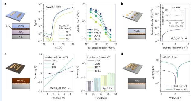 圖4使用絲表面活性劑的水激活納米器件。基于IGZO:SF的場效應(yīng)晶體管(FET)。中間:用不同的晶體管的轉(zhuǎn)移曲線。右圖:不同SF晶體管的電荷遷移率。數(shù)據(jù)點(diǎn)和誤差條顯示平均值±s.d.(樣本數(shù)為3)。以及制備的MAPbI3的薄膜的I-V特性。d,基于NiO:SF的光電探測器的結(jié)構(gòu)(左)和在不同側(cè)向電壓(中)和時(shí)間(右)下的光探測器的結(jié)構(gòu)(左)及其在白光照明下的I-V特性(右)。(右圖)。所有器件都是在疏水性基底上制造的SF基絕緣體的結(jié)構(gòu)(左)及其電流密度-電場曲線。