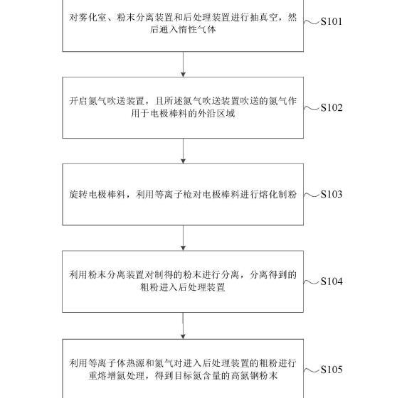 S105,利用等離子體熱源301和氮氣對進入后處理裝置300的粗粉進行重熔增氮處理,得到目標(biāo)氮含量的高氮鋼粉末。