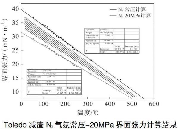 根據上述分析,并考慮到在較高溫度下渣油組成的劇烈變化導致的計算偏差情況,可以計算得到N2在常壓條件下以及高壓條件下的界面張力,從而對H2在高壓條件下的界面張力進行限定。