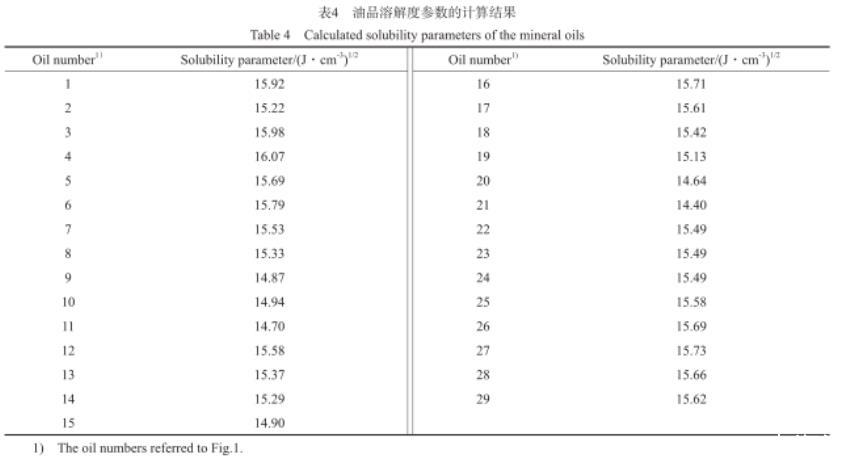 1)通過表面張力估算法測定低芳淺色礦物油的溶解度參數。根據石油石化行業標準和國家標準,測定11種含弱極性鍵的有機溶劑及29種常見的低芳淺色礦物油的關鍵數據,得出由表面張力估算溶解度參數的表達式中的各個系數,進而得出由表面張力來表示的溶解度參數表達式。