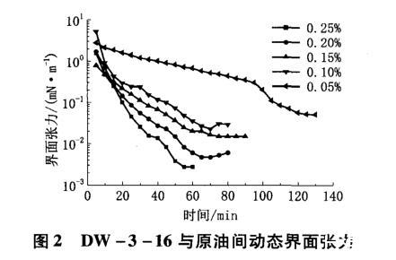 從圖2看出,DW-3-16含量為0.20%~0.25%時,DW-3-16使得油水界面張力達超低界面張力(10-3mN/m);隨著含量增加,其界面張力逐漸降低,且在50 min內達到平衡。
