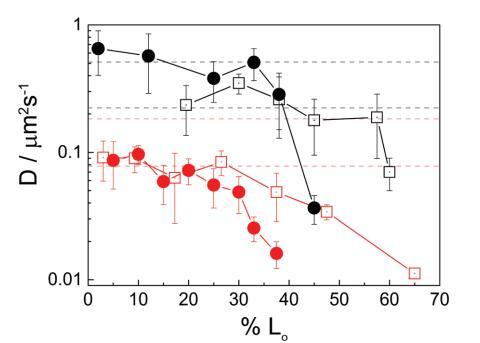 圖 2 擴散系數(D)的實驗值 小域 (1–3 mm) 作為面積百分比的函數 由液體有序相。 正方形代表中性系統和 環繞帶電系統。 黑色符號對應 氣水界面處的單層和雙層的紅色符號。 虛線對應于計算的 Dt 值的范圍 域大小的范圍,使用方程 (2) 或 (3)。 實線只是畫的 引導眼睛。