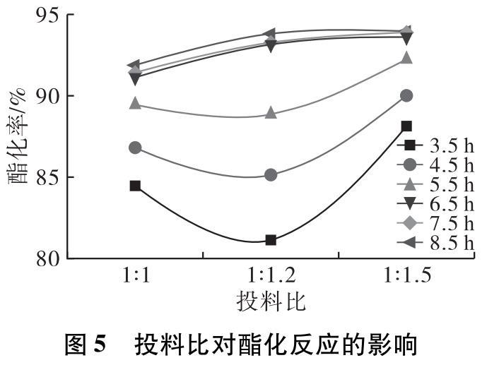 在投料比分別取1∶1、1∶1.2、1∶1.5,預熱溫度80℃,預熱時間5 min,0.4%的4?型分子篩催化劑,反應溫度180℃,反應時間8.5 h條件下進行酯化反應。反應3.5 h后每隔1 h取樣測試產物酸價,計算酯化率隨時間的變化,結果如圖5所示。