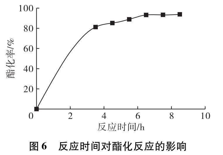 由圖6可知,隨著反應時間的延長,反應速率逐漸減慢,酯化率不斷增加,當反應時間為6.5 h之后反應逐漸趨于平衡,繼續延長反應時間對酯化率并沒有很大的影響。繼續延長反應時間不僅會增加產物被氧化的風險,而且還會造成資源浪費。綜合考慮,選擇反應時間為6.5 h。