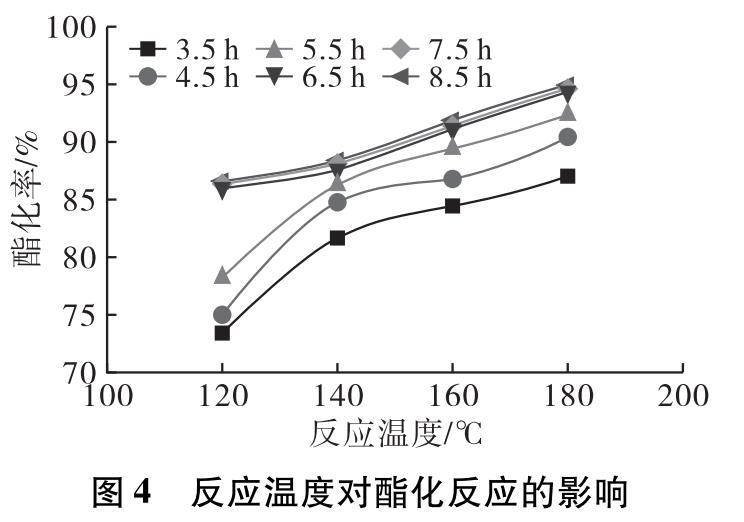 在投料比1∶1,預熱溫度80℃,預熱時間5 min,0.4%的4?型分子篩催化劑,分別設定反應溫度為120、140、160、180℃,反應時間8.5 h條件下進行酯化反應。反應3.5 h后每隔1 h取樣測試產物酸價,計算酯化率隨時間的變化,結果如圖4所示。