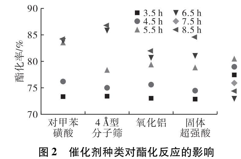由圖2可知,在相同的工藝條件下4?型分子篩的催化效率高于其他催化劑。原因主要有兩點:首先,4?型分子篩復雜的孔道結構性相比其他催化劑增加了催化反應面積,并且具有較高的活性和穩定性;其次,由于試驗過程沒有進行分水處理,導致反應產生的水滯留在體系中,體系達到平衡,而4?型分子篩具有一定的吸水作用,可以使平衡向正反應方向移動,提高了酯化率。而且在試驗后處理方面,4?型分子篩只需過濾處理,回收后還具有一定的催化活性,可以重復使用。綜合考慮,最終選擇4?型分子篩作為反應的催化劑。