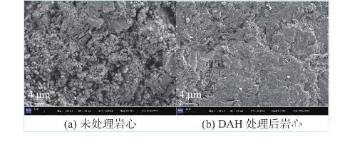將打磨好的未處理巖心和防水鎖劑DAH處理后的巖心采用掃描電鏡進(jìn)行測(cè)試,結(jié)果如圖9所示。由圖9(a)可知,未處理的巖心表面較為粗糙,存在較多大顆粒與微孔隙,在親水礦物和毛細(xì)管力的綜合作用下,巖心表面呈親水性。如圖9(b)所示,DAH處理后的巖心表面更為光滑,微孔隙數(shù)目減少,這是因?yàn)榉浪i劑中的DAT分子通過(guò)靜電作用在巖心表面吸附形成薄膜。DAT分子兩端的季銨結(jié)構(gòu)可以通過(guò)靜電作用吸附在砂巖表面,中間的聚硅氧烷鏈段具有良好的柔韌性和旋轉(zhuǎn)靈活性,使得DAT分子可以在巖心表面密集覆蓋。同時(shí)聚硅氧烷鏈段的柔韌性也使其兩側(cè)的甲基可以高密度堆積,這種堆積使得巖心表面獲得較強(qiáng)的疏水性,從而降低了液相返排阻力,減輕了水鎖損害。