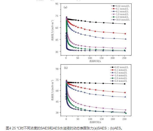 從圖4可以看出所測不同濃度不同表面活性劑的表面張力在初始階段均快速下降,一定時間后趨于平穩(wěn)狀態(tài)。這是因為動態(tài)表面張力測試過程中新形成的表面遠偏離于平衡態(tài),吸附層離子的濃度很低,體相與吸附層的濃度差大,因此動態(tài)表面張力變化很大。隨著吸附的進行,次表面濃度和表面濃度逐漸增大,擴散和吸附的速度均逐漸降低,動態(tài)表面張力隨著吸附時間的增加而降低的趨勢也逐漸變得平緩。當表面活性劑濃度增大時,表面張力的下降幅度和速度也隨之增大,而且相應地縮短了到達平衡狀態(tài)的時間。這種隨體系濃度的增加達到平衡所需的時間越短的趨勢與已經(jīng)報道的一些烷基表面活性劑的結果是相一致的。在相同濃度下,SAES表面張力下降的速率大于AES,這是由于SO4-在碳氫鏈中間的化合物比在端點者擴散速度快。