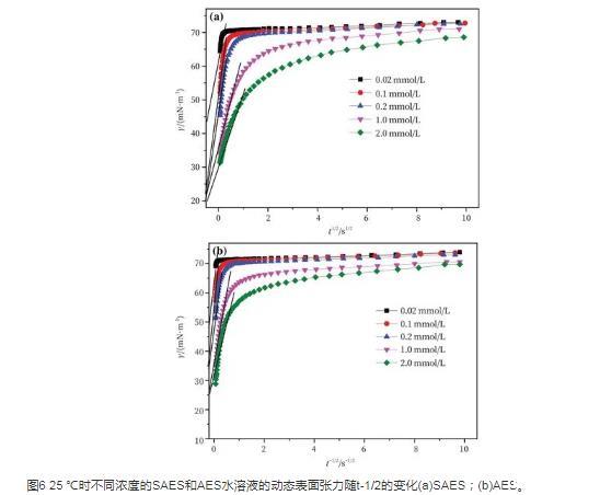 圖6 25℃時不同濃度的SAES和AES水溶液的動態(tài)表面張力隨t-1/2的變化(a)SAES;(b)AES。