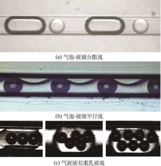 上述不同類型的微通道中所形成的流型也是學者們重點關注的內(nèi)容。在材料制備領域,流型是決定合成材料結(jié)構(gòu)的關鍵因素且直接影響著材料的相關性能;在過程強化領域,不同流型的強化效果差別較大,選擇并調(diào)控合適的流型是重中之重;在三相反應中,流型可決定反應的轉(zhuǎn)化率和選擇性,是需要優(yōu)化的重要參數(shù)之一。相比于兩相體系,三相體系由于流體間更為復雜的相互作用及更高的自由度而呈現(xiàn)出了更多的流動形態(tài)(圖3)。如Su等在十字形微通道中成功調(diào)控出液滴氣泡間隔排列的氣液液三相流。Xu等基于同軸環(huán)管微設備實現(xiàn)了氣液液雙乳液的可控制備,并揭示了流量和界面張力等因素對雙乳液結(jié)構(gòu)的影響。Wang等在雙T形通道內(nèi)通過調(diào)節(jié)操作條件可控制備了“水包油包氣”和“含有氣泡的液液平行流”兩種結(jié)構(gòu)。Rajesh等通過觀察液滴氣泡的形狀及位置關系定義了“氣柱-液柱”“彈狀-液滴”“液柱-雙氣彈”等流型。除了實驗手段Rajesh等借助VOF數(shù)值模擬方式從機理上揭示了氣液液三相流的流動規(guī)律,歸納了不同Ca和We范圍內(nèi)的流型特征和規(guī)律。此外,Yang等通過傳質(zhì)引發(fā)相分離的方法成功調(diào)控出氣液液雙乳液,該方法能實現(xiàn)更大范圍內(nèi)氣泡直徑尺寸和液膜厚度的調(diào)節(jié)。