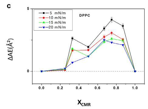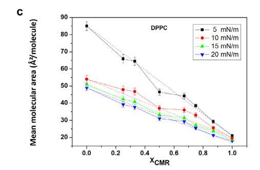 純和混合單層的 pA 等溫線與分子面積的關(guān)系如圖 1 所示。CMR/DPPG 等溫線顯示出與純 DPPG 脂質(zhì)相似的趨勢(圖 1a)。 相似相 對(duì)所有 CMR/DPPG 混合物都觀察到了轉(zhuǎn)變。 DPPG 和 DPPC 顯示崩潰壓力 (DPcoll) 為 52 mN.m-1 次方和 60 mN.m-1次方 , 分別。 一個(gè)過渡 (p ffi 3 mN.m-1次方 ) 從液體 發(fā)現(xiàn)純 DPPE 單層膨脹為凝聚相 與 D. coll 在 ffi55 mN.m-1次方 . 為 D. coll 獲得的值 純脂質(zhì)與文獻(xiàn)一致(Vollhardt 等人, 2000; 諾沃塔斯卡等人,2014 年)。
