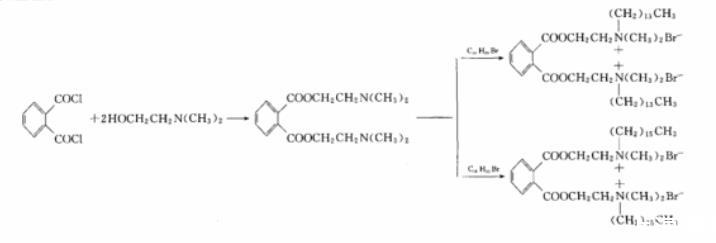 雙子(gemini)型表面活性劑比傳統(tǒng)表面活性劑有更多優(yōu)良性能:更高的表面活性,更低的Krafft點和更好的水溶性;在降低水的表面張力方面表現(xiàn)出更高的效率。Gemini表面活性劑近年來已成為國內(nèi)外膠體和界面化學(xué)的研究開發(fā)熱點和重點。但現(xiàn)有一些雙子表面活性劑降解能力較差,使其應(yīng)用受到限制。因此開發(fā)對環(huán)境無危害、易生物降解、高效多功能的環(huán)境友好型表面活性劑已成為人們共同關(guān)心的話題之一。從分子結(jié)構(gòu)而言,酯基和酰胺基是易于自然降解的基團,如今含有酯鍵或酰胺鍵的表面活性劑的合成及性能研究逐漸成為研究熱點。本文在前人研究的基礎(chǔ)上采用N,N-二甲基乙醇胺與鄰苯二甲酰氯反應(yīng)得到二(二甲基胺基乙基)鄰苯二甲酸酯,然后二鄰苯二甲酸酯再分別與正溴代十六烷和正溴代十四烷反應(yīng),經(jīng)反應(yīng)和處理得到雙季銨基鄰苯二甲酸酯基表面活性劑SHZ16和SHZ14,在制取得到產(chǎn)物后,對它們的性能進行測定并作對比研究。