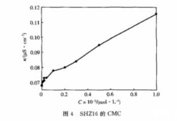 b.SHZ16的臨界膠束濃度為比SHZ14要低,這是由于SHZ16的碳?xì)滏湵萐HZ14稍長(zhǎng),導(dǎo)致疏水基之間的相互干擾減少,造成在表面的自組織能力增強(qiáng),表面吸附能力有所升高,從而使臨界膠束濃度降低。