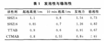 由表1可見(jiàn):SHZ16的發(fā)泡性比SHZ14差,但穩(wěn)泡性要好于SHZ14,原因可能是隨著泡沫的生成,液體的表面積增加,表面能增加所消耗的能量增加,而且SHZ16的分子比SHZ14的大,那么單個(gè)分子的表面積就大,需要克服表面能消耗的能量也大,因此起泡性要差些而穩(wěn)泡要優(yōu)于SHZ14。