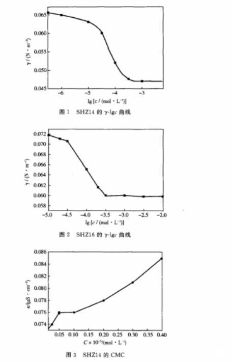圖1、圖2分別為產(chǎn)物SHZ14和SHZ16的γ-lgC曲線。圖3、圖4分別為SHZ14和SHZ16的κ-C曲線。