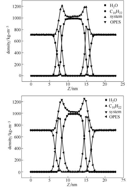 本文提取體系穩(wěn)定的S80、S120進行分析,兩個體系的各部分密度圖如圖4所示。在平衡狀態(tài)下兩體系中水的平均密度分別為989.86 kg·m-3、992.43 kg·m-3,與國際溫標(biāo)318 K時水密度990.2 kg·m-3值接近;另外,兩體系中癸烷平均密度為711.49 kg·m-3、710.72 kg·m-3,與真實狀況下癸烷密度711.2 kg·m-3值接近,這表明模擬體系的模型選擇、力場參數(shù)都是準(zhǔn)確的,可以得出可靠結(jié)論。