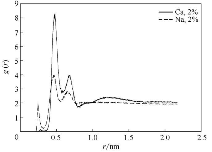 圖10中曲線分別代表在2%NaCl溶液、2%CaCl2溶液中磺酸基中的氧原子與水中氫原子之間的徑向分布函數(shù),如圖所示兩條曲線的峰值并未有太大差別,這說明OPES對Na+、Ca2+都有很好的抗鹽性。