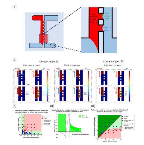 圖2展示了用于模擬液體填充和圖案化條件的數值模擬和實驗驗證,進一步分析了在微流體平臺中實現毛細釘扎過程的成功條件。圖2a展示了與圖案化成功條件相關的物理參數,包括柱子的高度、間距和側通道的長度。通過這些參數的控制,可以預測液體在微柱之間的保留情況。圖2b展示了液體填充過程的數值模擬,包括在不同接觸角(例如60°和120°)條件下的液體流動和釘扎效果。模擬結果顯示了如何通過改變接觸角和壓力控制液體在微柱之間的流動和停留。圖2b的模擬驗證了在較大接觸角下液體被釘扎在微柱邊緣的效果。圖2c至2e總結了不同微柱高度、間距和側通道長度對液體保留過程的影響,通過這些參數優化可實現液體在微柱之間的穩定釘扎,適用于后續的細胞培養實驗。