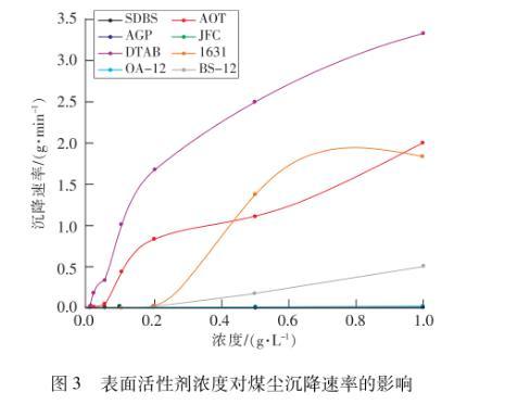 由表4和圖3可以看到,當濃度為0.1 g/L時,煤塵在AOT和APG溶液中的沉降時間不到1 min,而在陽離子和兩性型表面活性劑溶液中的沉降時間超過1 h。在同一濃度下,煤塵在不同表面活性劑溶液中的沉降時間相差較大,表面活性劑自身性質影響潤濕煤塵的作用。當濃度增大到各表面活性劑的臨界膠束濃度附近時,煤塵在陰離子和非離子表面活性劑中的沉降時間會急劇下降,縮短至5 min之內,但在陽離子和兩性型表面活性劑中沉降時間依然大于1 h??傮w而言,8種表面活性劑潤濕煤塵的能力由強到弱依次排序為:APG>AOT>JFC>SDBS>OA-12>BS-12>1631>CTAB,這與表面活性劑降低表面張力的能力排序基本一致。陽離子表面活性劑潤濕煤塵效果最差,主要是因為親水頭基的正電荷與煤塵所帶負電荷之間的靜電力大于疏水基團之間的范德華力,形成了親水基團朝向煤塵表面、疏水基團朝向水的單分子膜,不利于潤濕。APG潤濕煤塵效果最好主要與其自身結構有關,APG分子結構碳原子上的醇羥基與水分子之間存在強烈相互作用,間接弱化了烷基糖苷分子結構中親水基團與煙煤表面含氧親水官能團之間的吸附作用,更有利于疏水基團與煤塵表面的疏水基團發生強烈相互作用,以親水頭基伸向溶液,疏水尾部吸附在煤塵上的方式排列,降低了溶液及固-液界面張力,增加了煤塵親水性。APG濃度達到0.02 g/L時,煤塵沉降時間僅為057 min,沉降速率為0.18 g/min,潤濕煤塵效果良好,當濃度繼續增大,潤濕煤塵作用變化不大,綜合考慮成本及效率后,選擇濃度為0.02 g/L的APG作為低階煤用噴霧抑塵法的添加劑。