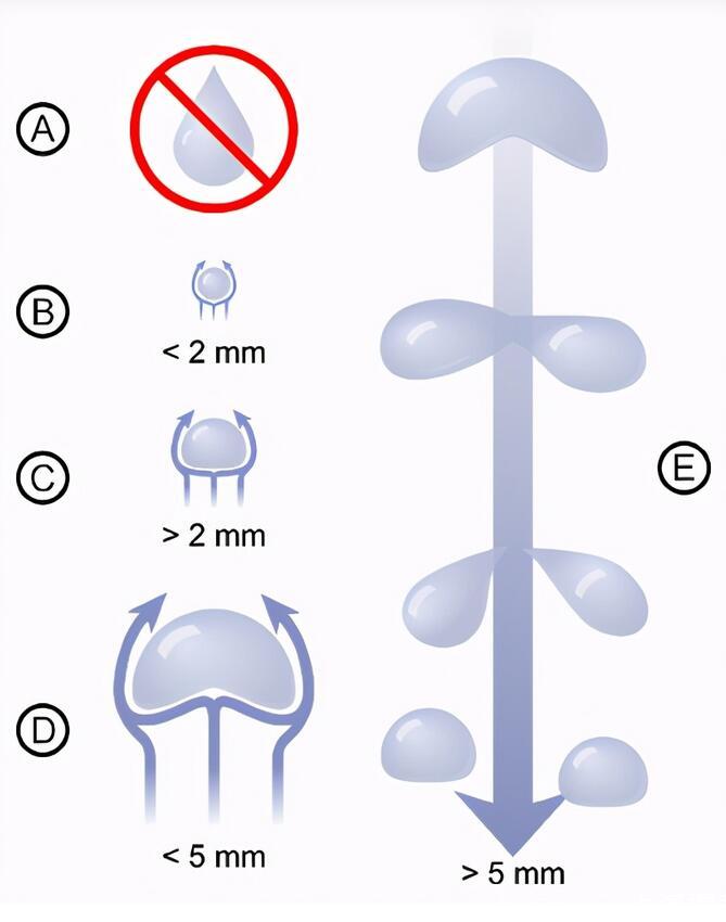 雨滴在表面張力、壓力、重力三種力的作用下,雨滴在下降的過程中首先雨滴底部會出現向內凹陷的情況并且會形成一個向上運動的空腔,隨著空腔的體積越變越大,向上運動的空腔位置就會越靠近頂部,當空腔運動到雨滴再也無法用結合的力量來粘合雨滴的時候,空腔就好像一把“無情的刀”將雨滴分割成體積大小不等的水滴,然后大大、小小的水滴又會以大雨滴吞并小雨滴的方成從成結合成新的大雨滴。