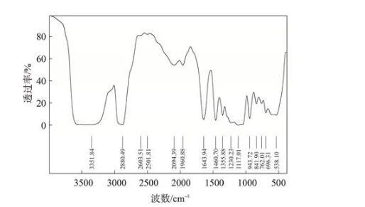 TPHS表面活性劑的紅外光譜譜圖如圖2所示。其中,3351 cm-1處為分子間氫鍵、羥基O—H的伸縮振動峰;1356 cm-1處為羥基O—H的面內(nèi)彎曲振動峰;2880 cm-1處為甲基C—H的伸縮振動峰;1230和1117 cm-1處為磺酸鹽S=O鍵的不對稱伸縮振動峰;696、762和841 cm-1處分別為苯環(huán)芳烴鄰位、間位、對位的C—H鍵的面外彎曲振動峰;1460 cm-1處為苯環(huán)骨架C—C伸縮振動峰;1960和2094 cm-1處為苯環(huán)上C—H的伸縮振動吸收弱的倍頻譜,538 cm-1處為取代苯環(huán)的面外彎曲振動峰,證明所合成的表面活性劑為目標產(chǎn)物。