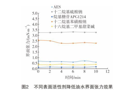 圖2為不同表面活性劑降低油水界面張力的情況。從圖2可知,在5種表面活性劑質量分數均為0.2%的情況下,十六烷基二甲基甜菜堿和烷基糖苷APG1214效果最好,分別能將油水界面張力降至0.38 mN/m和0.17 mN/m,低于0.50 mN/m。這是因為原油飽和分和芳香分中C12~C16組分所占比例大,使得這兩種表面活性劑的疏水端碳原子數與其匹配較好,根據“相似相溶”原理,這兩種表面活性劑疏水端擴散進入油相的能力較強,因而降低油水界面張力的效果更好。