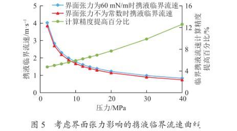 (1)界面張力對攜液臨界流量影響。如圖5所示為氣體相對密度為0.7,溫度為100℃時,利用新模型計算當界面張力為常數(60 mN/m)和界面張力隨壓力變化時不同壓力下的攜液臨界流速??紤]界面張力變化的攜液臨界流速要比界面張力為常數時的小,計算精度更高。且隨著壓力的增大,攜液臨界流速的計算精度提高百分比,逐漸從4%上升至12.5%,平均提高了8%。