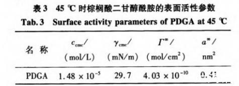 表3 45℃時棕櫚酸二甘醇酰胺的表面活性參數