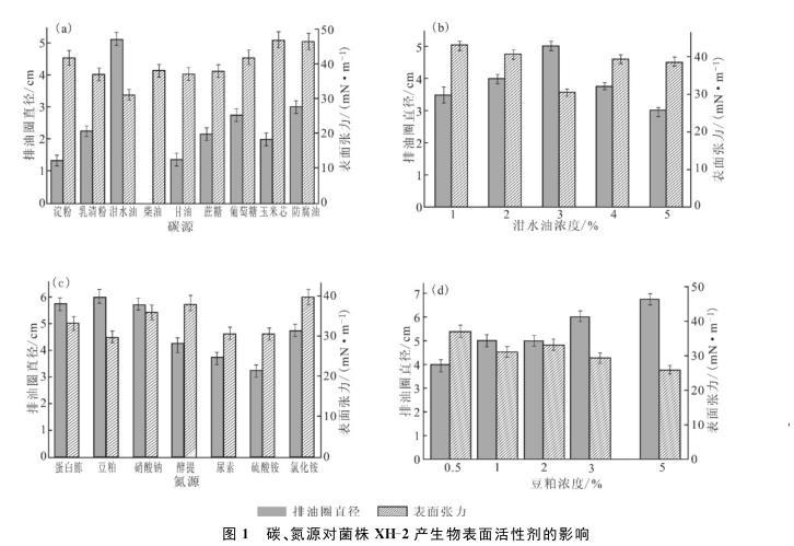 圖1碳、氮源對菌株XH-2產(chǎn)生物表面活性劑的影響