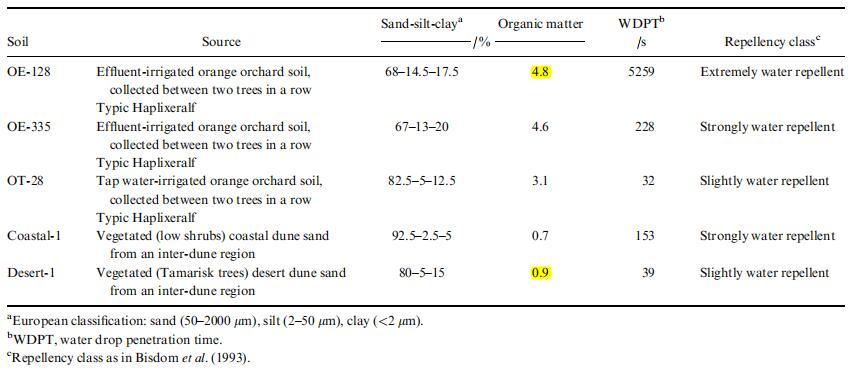 來自以色列不同地區的五種防水土壤 過篩(1 毫米)并在室溫下儲存在玻璃容器中 實驗室條件(平均溫度 ? 24.5°C,平均 相對濕度 (RH) ? 65%)。 兩種土壤 (OE-128 和 OE-335; 典型的單氟草胺)是從相同的 污水灌溉的商業柑橘園與以前一樣 研究(Wallach 等人,2005 年;Graber 等人,2006 年)位于 以色列沿海平原的中部(31°59¢30.562)。 一 土壤(OT-28;典型單頭草)是從水龍頭中獲得的 同一商業果園的水灌溉柑橘地塊。 一種 沙丘沙是從附近的沙丘間地區獲得的 位于地中海的尼察尼姆自然保護區 (31°16¢37.242) 海(Coastal-1)和來自沙間地區的粘土砂 內蓋夫北部沙漠 (30°52¢02.592; (Desert-1) 的 Halutza 附近。表 1 列出了顯著的土壤特征。