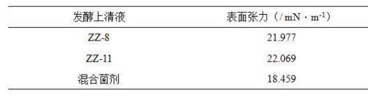 表面張力是洗油劑對原油洗脫能力的重要指標(biāo),數(shù)值越低、洗脫能力越強(qiáng)。測試結(jié)果顯示解淀粉芽孢桿菌(Bacillus amyloliquefaciens)ZZ-11和膠凍樣芽孢桿菌(Bacillus mucilaginosus)ZZ-8發(fā)酵上清液均能降低表面張力,混合菌劑發(fā)酵上清液的表面張力值更低。