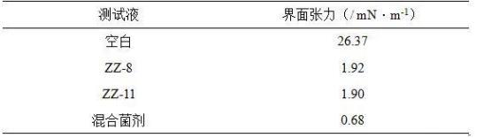 從表2實驗結(jié)果中可以看出與空白相比解淀粉芽孢桿菌(Bacillusamyloliquefaciens)ZZ-11、膠凍樣芽孢桿菌(Bacillus mucilaginosus)ZZ-8的界面活性好,油水界面低至1.92 mN/m和1.90mN/m,為低界面張力水平?;旌暇鷦┑慕缑婊钚愿鼮橥怀?,低至0.68mN/m。