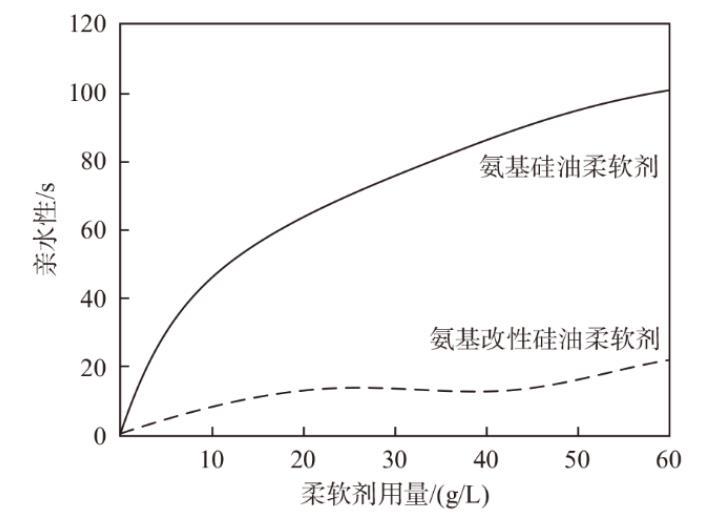 4)當用量為20 g/L時,氨基改性硅油柔軟劑親水性為10.4 s;當用量為50 g/L時,氨基改性硅油柔軟劑親水性小于20 s,與氨基硅油柔軟劑相比,氨基改性硅油柔軟劑在親水性方面有所改善。