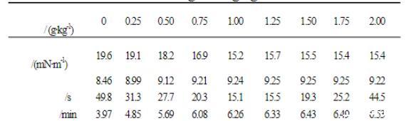 由圖1可知,隨著表面活性劑濃度的逐漸增加,溶液的表面張力顯著降低,當濃度增加到一定值時,表面張力下降到較低值,當濃度繼續增加時表面張力變化逐漸趨于平緩。YM-316氟碳表面活性劑水溶液的臨界膠束濃度為2.5×10-4mol/L,臨界表面張力為15.3 mN/m。