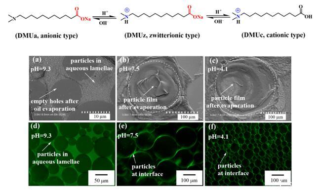 圖2新型頭基電荷可逆轉(zhuǎn)變型表面活性劑(DMUa)的結(jié)構(gòu)及其(0.5mM)與納米二氧化硅(0.1wt.%)協(xié)同穩(wěn)定的乳狀液的微結(jié)構(gòu)及pH-響應(yīng)性。(a)和(d)oil-in-dispersion乳狀液,(b)和(e)大油滴Pickering乳狀液,(c)和(f)小油滴Pickering乳狀液