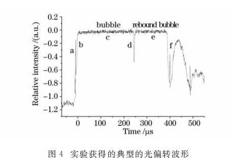 圖3給出了探測光經(jīng)過脈動空泡的示意圖,圖中空泡脈動特性曲線是基于空泡半徑隨時間變化的數(shù)值模擬得到的。圖4即為由探測裝置圖2(a)獲得的對應(yīng)的典型光偏轉(zhuǎn)信號波形圖,它包含了激光作用于水中靶材時的三種物理現(xiàn)象和過程,即激光等離子體沖擊波、等離子體空泡及其反彈現(xiàn)象、空泡潰滅沖擊波。圖中峰a為激光等離子體沖擊波;c為等離子體空泡信號;e為空泡反彈信號;f為空泡收縮到最小泡體積時輻射的沖擊波信號;b為空泡膨脹壁;d為空泡收縮壁。