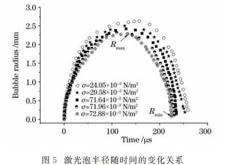從圖5可以看出,表面張力減緩了空泡的膨脹過程。在初期,空泡膨脹變緩的現(xiàn)象不甚明顯,愈到后期越明顯。液體張力越大,空泡對應(yīng)的最大泡半徑越小;表面張力加速了空泡的收縮。表面張力越大,空泡收縮所能達(dá)到的最小泡半徑越小,且表面張力縮短了空泡脈動周期。從圖5還可以看出表面張力對空泡潰滅的影響要強(qiáng)于對膨脹的影響。此外,激光泡半徑隨表面張力變化與液體的表面張力數(shù)值并不為線性關(guān)系,其關(guān)系有待研究。