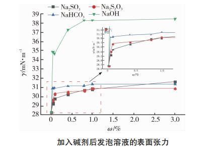 圖4是不同質(zhì)量分數(shù)堿劑發(fā)泡液表面張力的測試結(jié)果。強堿NaOH使發(fā)泡液表面張力明顯提高,在NaOH質(zhì)量分數(shù)3%時達到最大值38.3mN/m,隨后發(fā)泡液表面張力值保持穩(wěn)定,不受NaOH含量變化影響。說明NaOH濃度升高時OH-過多,造成圖4加入堿劑后發(fā)泡溶液的表面張力表面活性物質(zhì)停留于溶液表面,阻礙了OH-與更多表面活性物質(zhì)的反應機會,溶液表面張力不再受影響。圖4中弱堿Na2S2O3,NaHCO3變化規(guī)律與NaOH相似,低濃度時發(fā)泡液表面張力激增,達到質(zhì)量分數(shù)0.8%之后,表面張力值增幅減緩。NaOH加入使發(fā)泡液表面張力增加了35.7%,而其他3種弱堿無機鹽在濃度最大時(質(zhì)量分數(shù)3%)僅增加約10%.與強堿劑相比,弱堿劑對溶液表面張力影響較小。