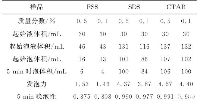 表1 FSS與SDS、CTAB的發泡力和穩泡性比較