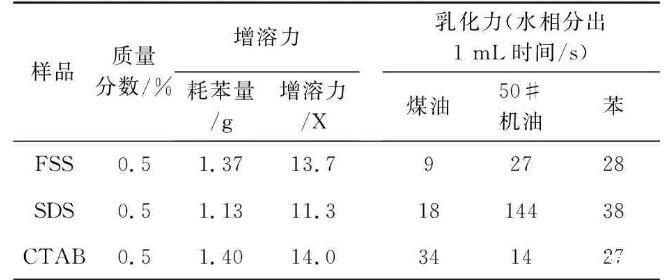 增溶力和乳化力也是表面活性劑的重要性能指標,表2列出了FSS的乳化力和增溶力測試結果,并與SDS、CTAB的性能進行對比。